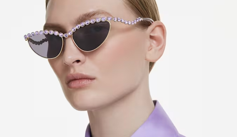 Swarovski’nin imzası pırıltı kristalleri, kedi gözü formu yorumladığı bu zarif güneş gözlüğünde de kaş çubuğunda ve saplarda yerini buluyor. Altın tonlu çerçeveye pembe kristaller eşlik ediyor.