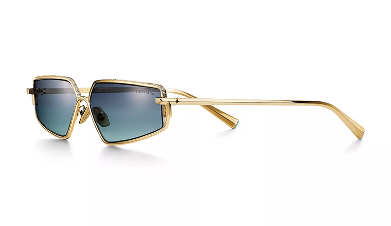 Tiffany Co. gözlük serisinin göz alıcı modellerinden Tiffany T güneş gözlüğü, altın kaplama metal çerçevesi, elde uygulanan kristal detayları ve azurit taşı rengi degrade camlarıyla harika görünüyor.