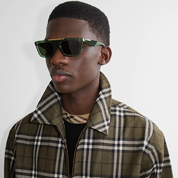 Burberry asetat ve nylon kullanarak klasik diktörtgen formu yorumladığı bu güneş gözlüğü tasarımını, kaş çizgisindeki ve şakaklardaki altın tonlu metal detayla benzersiz hale getirmiş.