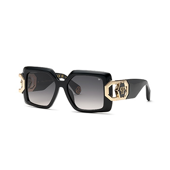 Hera by Plein offers a sleek style with its bold geometric lines and oversized square shape. The black premium acetate frame emphasizes the brand’s iconic luxury signature with gold details.