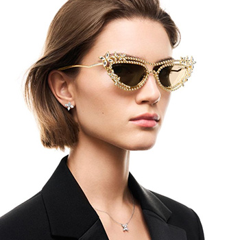 Tiffany&Co.’s limited-edition cat-eye design is adorned with 172 crystals, each of which reminiscent of delicately placed floral motifs, and the model is finely completed with gold mirrored lenses.