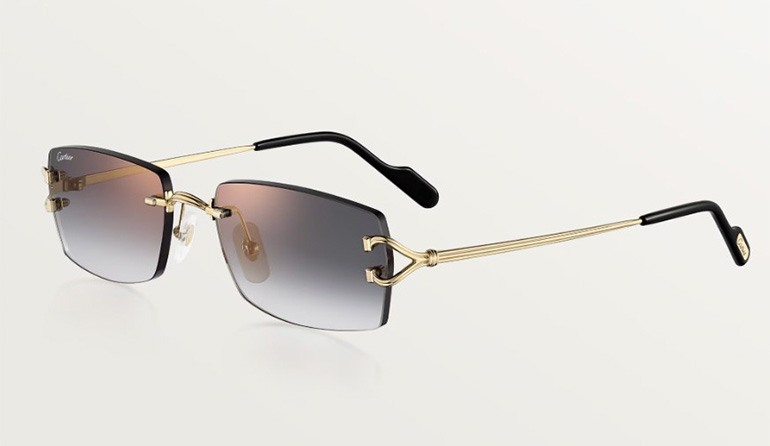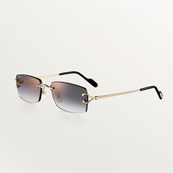 Rimless with a classic C de Cartier motif in a rectangular silhouette, this design is finished with golden metal temples and gradient grey lenses with a golden mirror effect, promising pure nobility.