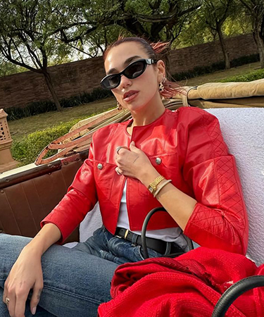 Dua Lipa, who chose a green place with a warm climate for the music video shooting of her new song, lives work and vacation together. The world-famous singer, who posed in an open-topped trolley with blue jeans, a white basic t-shirt and a stylish, red and short leather jacket with tricot sleeves, is seen in a good mood. Dua Lipa completed her style with sunglasses designed by Prada.