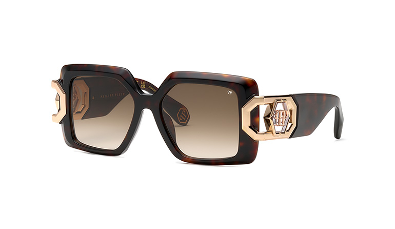 Cesur geometrik hatlar ve oversized siluet bu Philipp Plein tasarımının gücünü kanıtlıyor. Kaplumbağa kabuğu desenli çerçeve zamansız bir zarafet sunarken, altın tonlu metal saplar ve mimari formdaki amblem detayı mücevher benzeri etkiyle lüksü vurguluyor. Tasarımın degrade camlar formu yumuşatarak, iddialı tasarım ile modern lüks arasında rafine bir denge oluşturuyor.